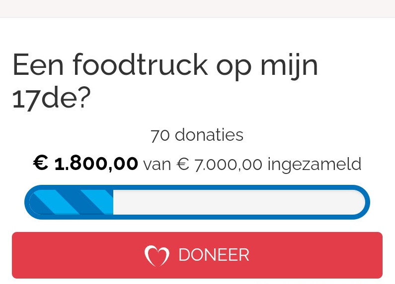 29-01-2023 De crowdfudingsactie is opgezet om zo geld in te kunnen zamelen voor de foodtruck. Deze crowdfunding is op 21 november gesloten met een bedrag van 1800 euro wat is opgehaald, ik heb ervoor gekozen om de crowdfunding te stoppen op de dag dat ik 18 ben geworden omdat de actie ´een foodtruck op mijn 17de´ heet en nu dat ik 18 ben geldt dit dus niet meer.
