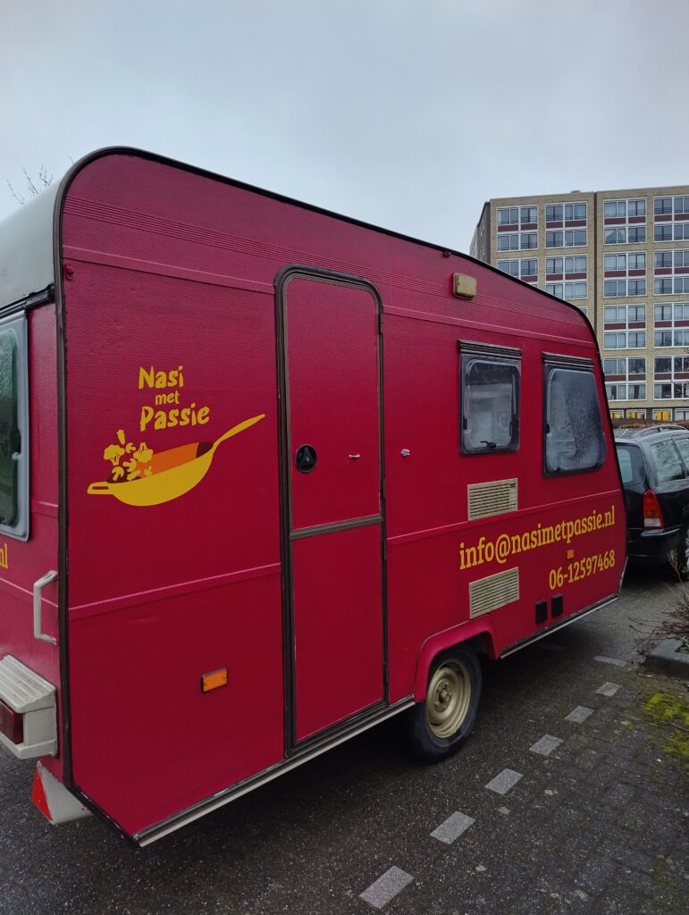 30-10-2023 De foodtruck begint nu ook wat meer kleur te krijgen, ik heb gekozen om de caravan rood met gouden accenten te maken. Het rood omdat deze kleur staat voor passie en het goud om toch een beetje een Indonesisch tintje te geven. De gouden accenten moeten nog verder aangebracht worden evenals dat het dak nog rood geschilderd moet worden.