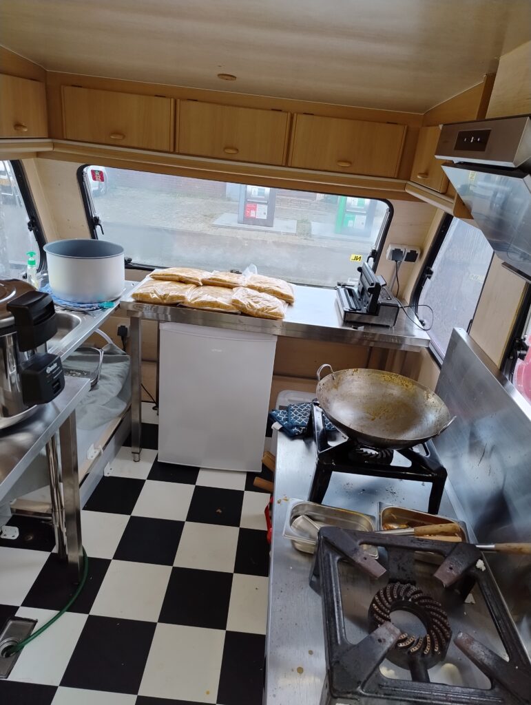 11-06-2024 Toen ging het opeens allemaal wel heel snel, binnen een maand stond ongeveer al het apparatuur evenals de werktafels in de foodtruck. De afzuigkap is netjes afgewerkt, er is een spatwand gemaakt voor achter de wok branders en er is een wasbak met stromend water vanuit een watertank onder de wastafel. Gelijk maar even alles uitgetest door de voorbereidingen erin te doen voor het eerste festival wat op de planning staat.